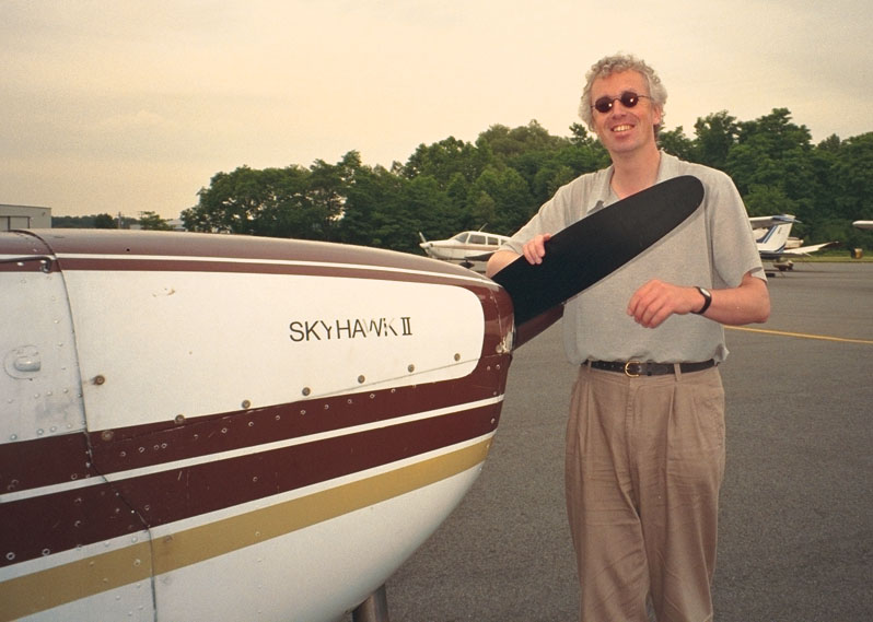 I started flying in 1996 and I am now a private, instrument-rated pilot. I learned to fly during a four-month sabbatical at Bell Laboratories where I was introduced to flying by several people in or near the Unix room: Ken Thompson, Dave Presotto, Fred Grampp, and Paul Glick. I joined their flying club, 150th Aero Flying Club based at Morristown Municipal Airport and started lessons in March 1996. John Martin taught me; we had lessons almost daily, weather permitting and I soloed on the 16th of April. One thing led to another. I took my final check ride on June 28th, literally the day before returning to Amsterdam and here is the result: me proudly standing next to N738SQ after taking up my partner Connie the day after the check ride. |