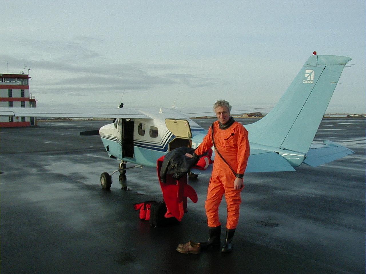 We caught some glimpses of the North Atlantic below us, but for the most part we had a solid undercast. We were wearing our survival suits up to our middle, and the two-person raft and satellite beacon were at my feet. The statistics show that the survival rate for ditchings, even in the middle of the Atlantic, is surprisingly good, provided the crew manages to prevent hypothermia by wearing survival suits. But, flying over the Atlantic Ocean, three hours from the nearest land, does not make you feel any too comfortable.