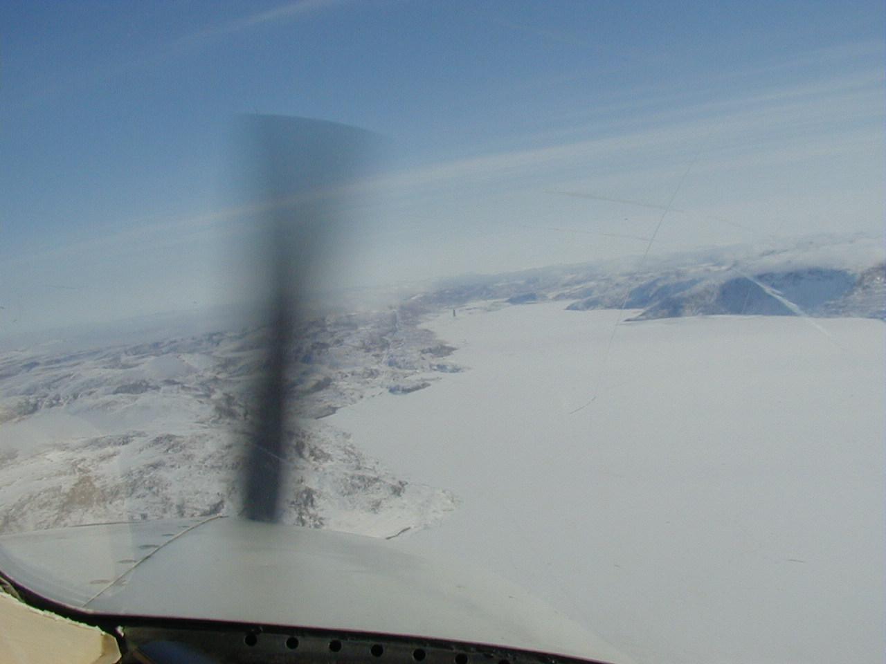 After takeoff, we flew out over the Fjord and looked down at the snowscape.